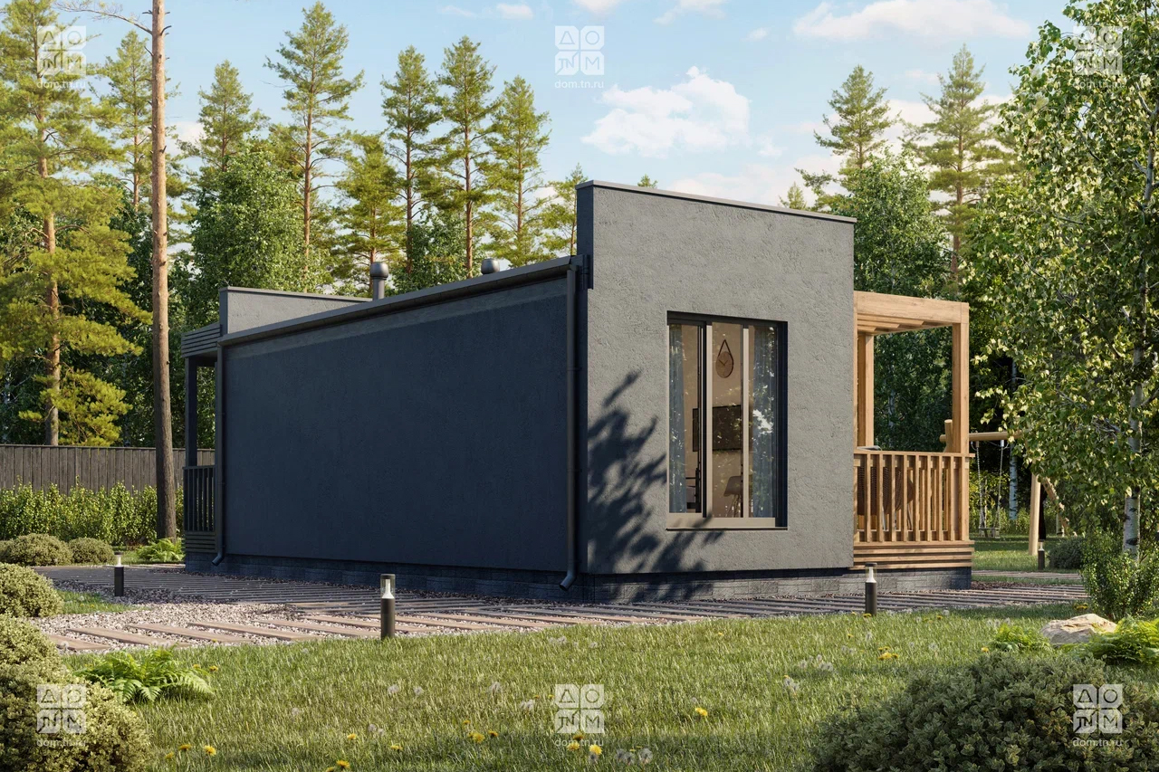 Эффектный одноэтажный дом с террасой под навесом и крыльцом. Его площадь составляет 38,38 м², что делает его очень просторным и комфортным.