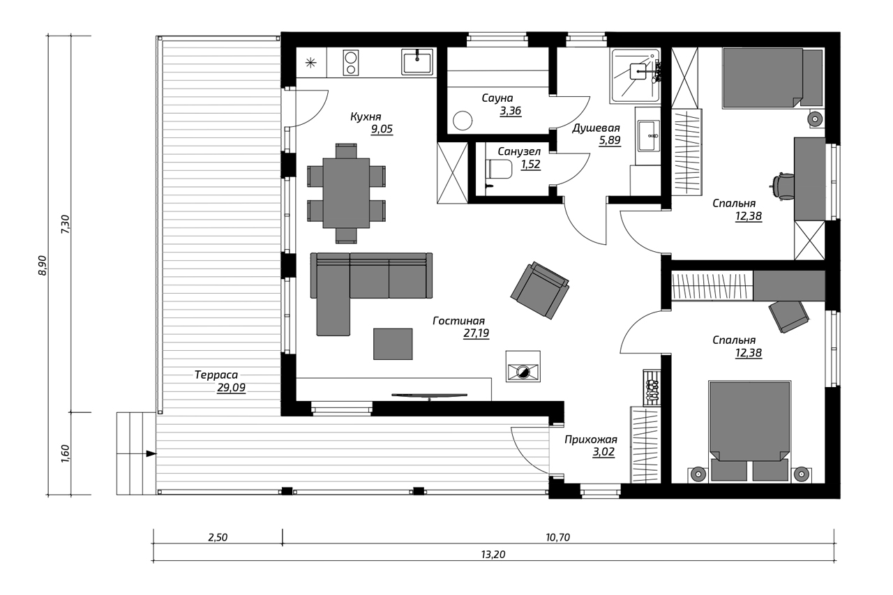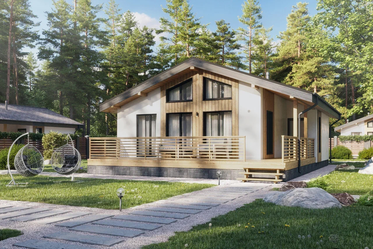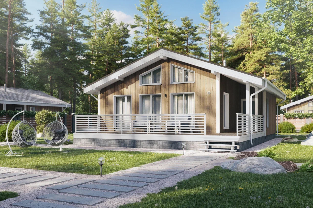 Планировка дома осталась прежней, но изменились размеры помещений. Под двускатной крышей расположены две спальни, кухня-гостиная, зона для отдыха и прихожая. К главному фасаду примыкает терраса без навеса, которая открыта с трёх сторон.