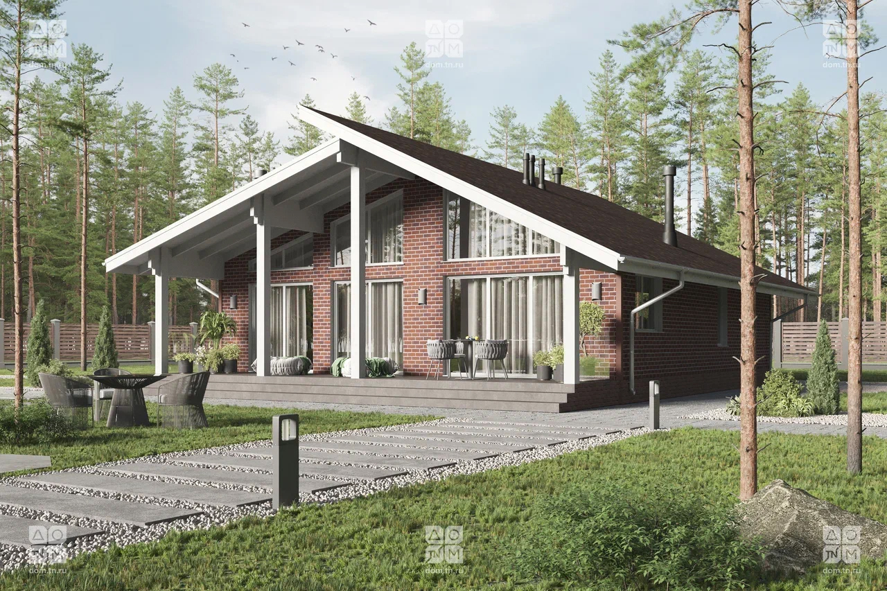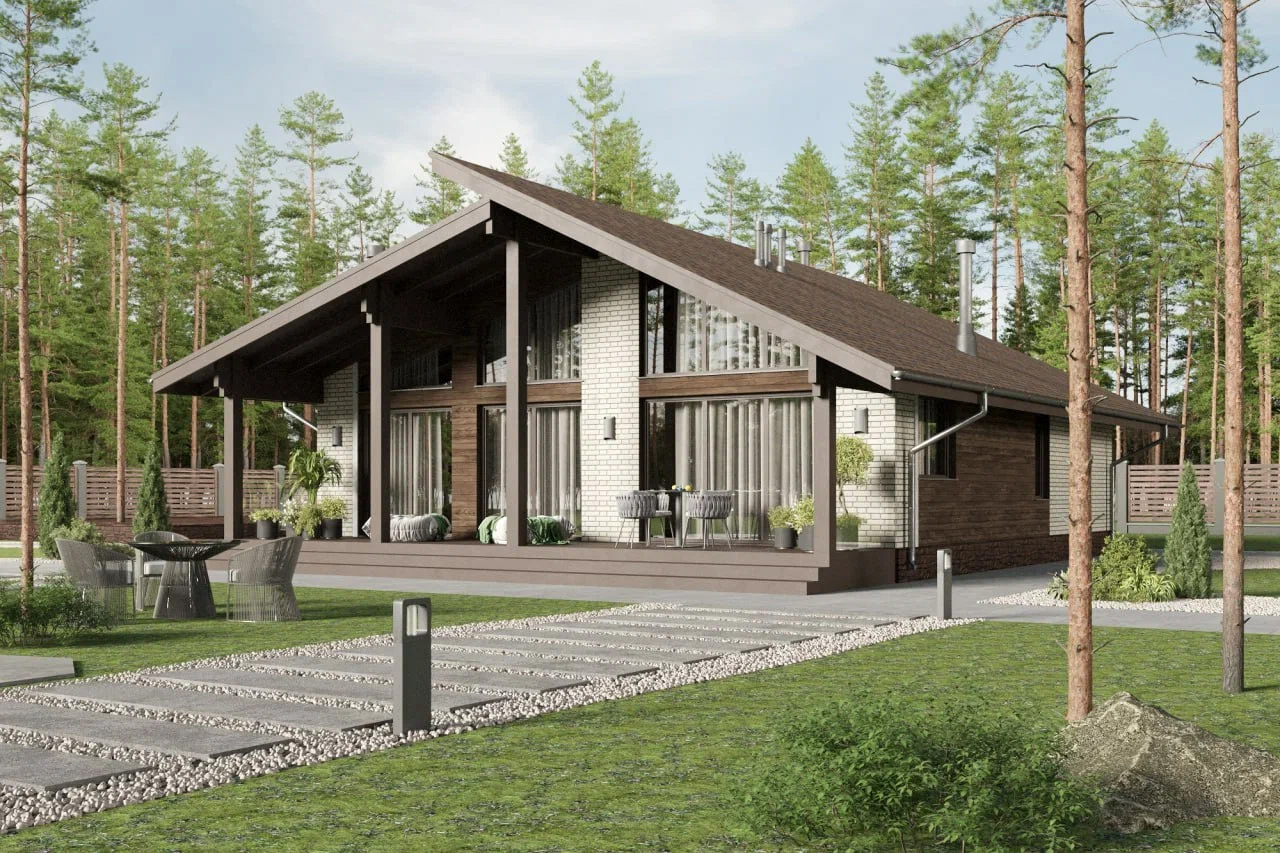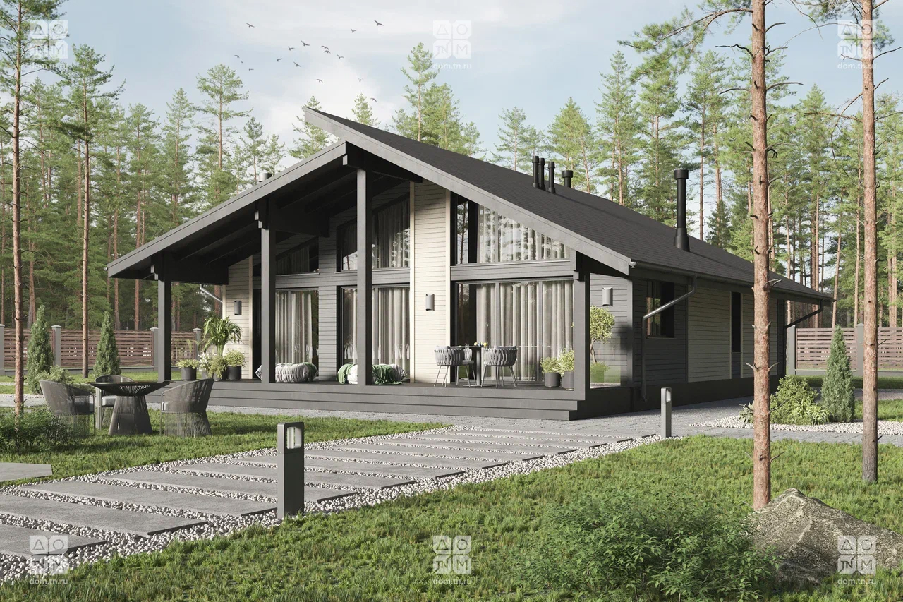 Современный загородный дом в скандинавском стиле общей площадью 116 м² с разноуровневой крышей, большими окнами от пола до потолка и просторной гостиной. В доме есть две спальни и большая крытая терраса.