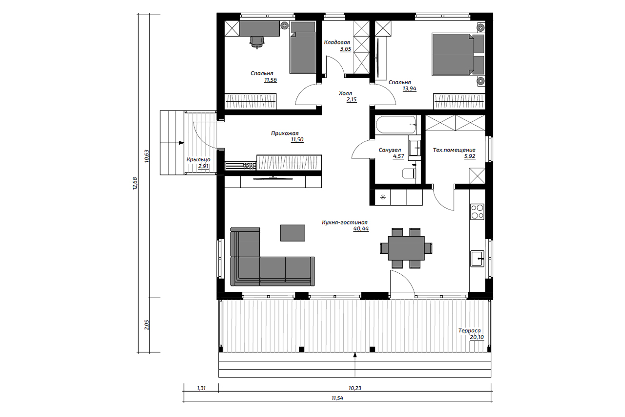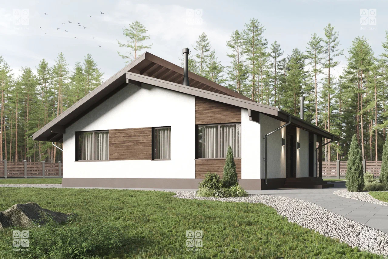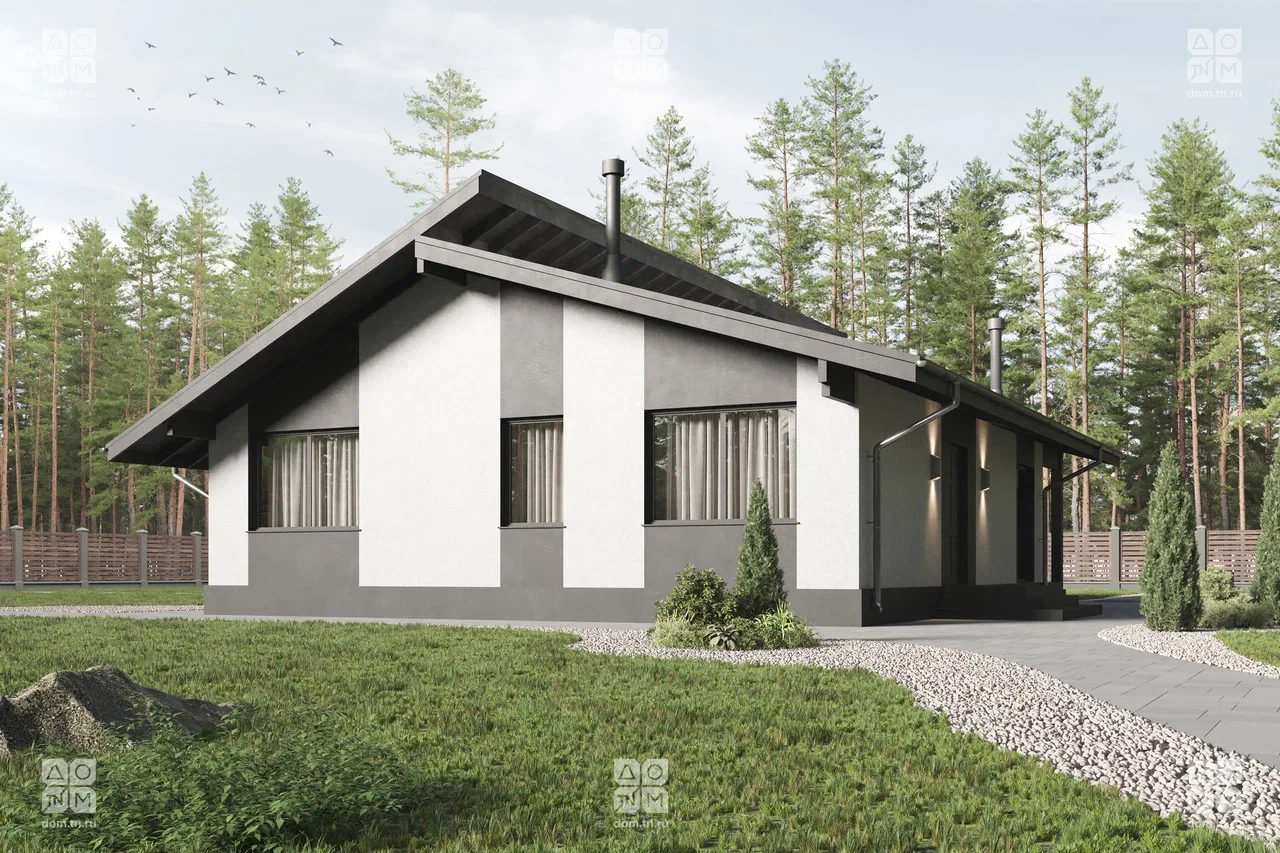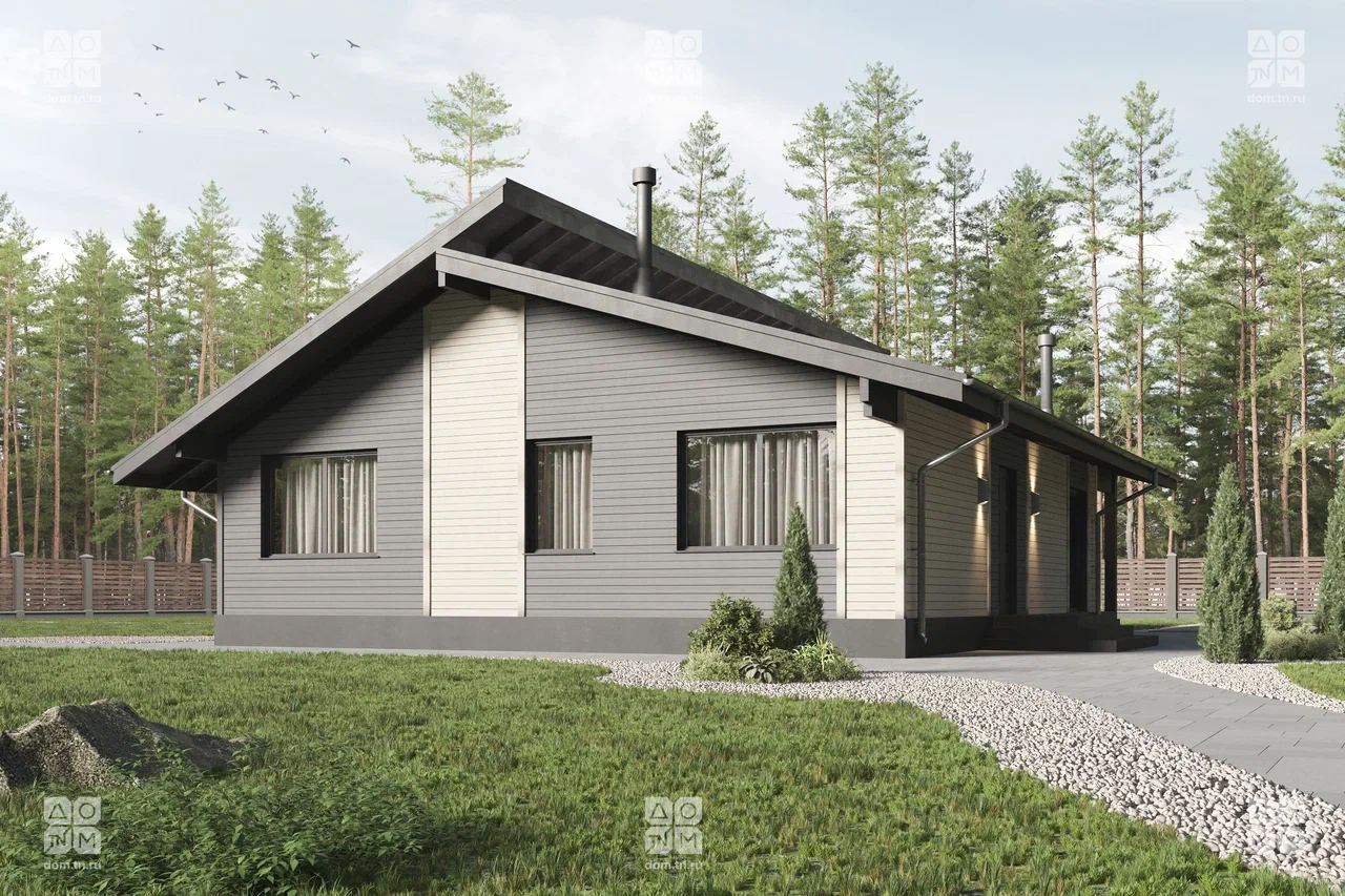 Современный загородный дом в скандинавском стиле общей площадью 116 м² с разноуровневой крышей, большими окнами от пола до потолка и просторной гостиной. В доме есть две спальни и большая крытая терраса.