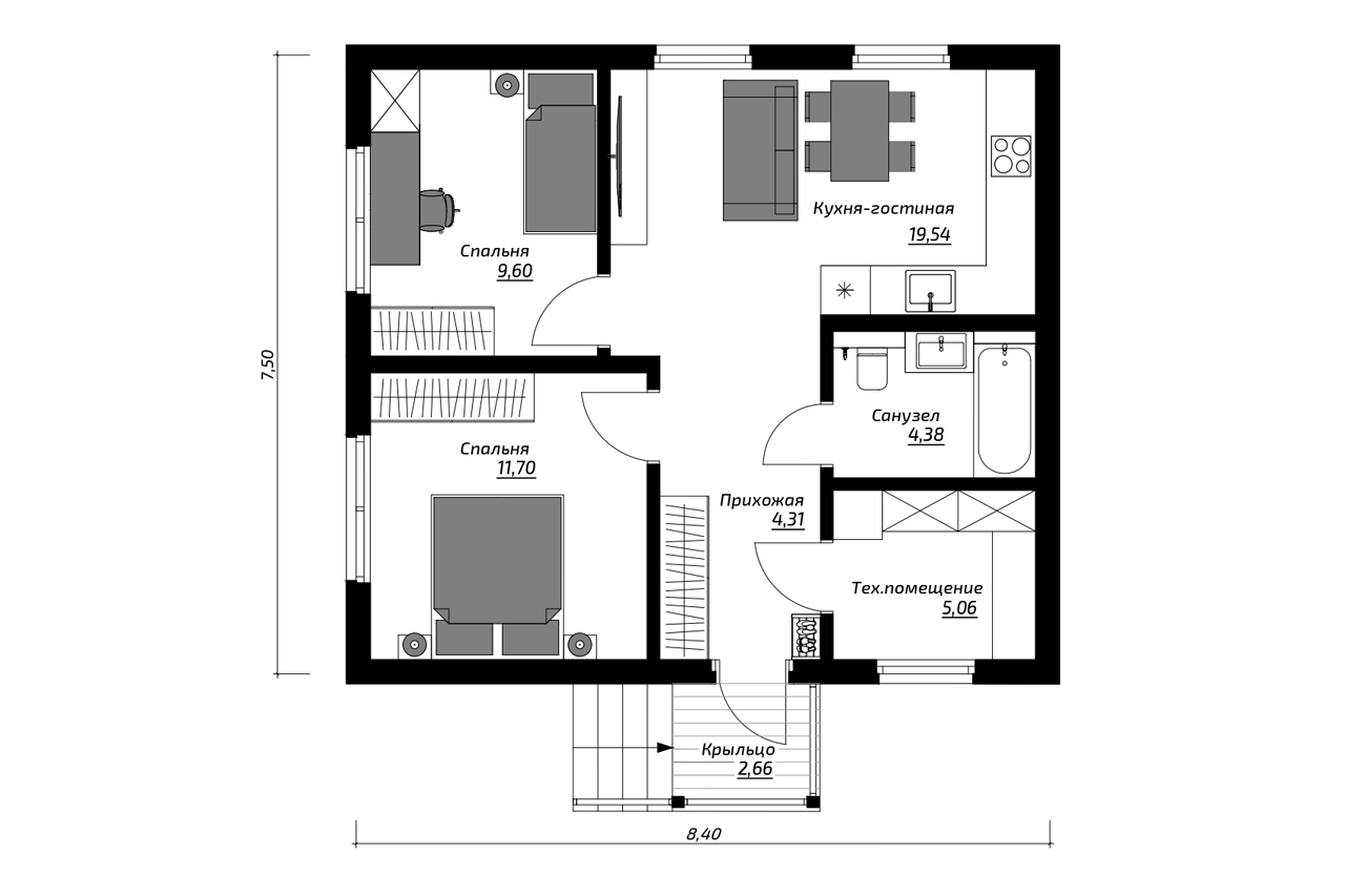 В правой части дома расположена котельная-постирочная площадью 5 м². Здесь можно разместить не только отопительное оборудование, но и стиральную и сушильную машины.