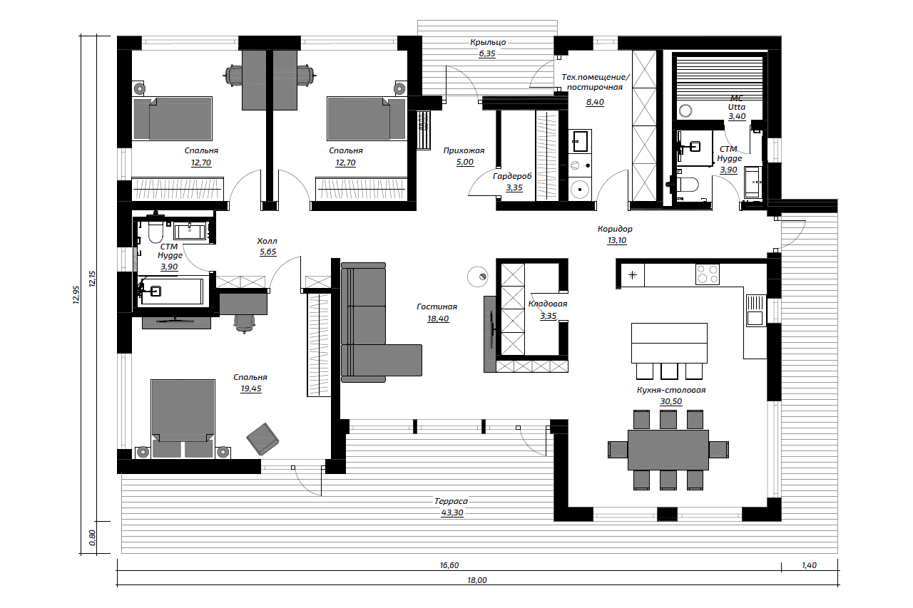 В доме есть всё, что нужно для комфортной жизни: кухня-столовая, гостиная, три спальни, гардеробная, постирочная, кладовая, два санузла и сауна.