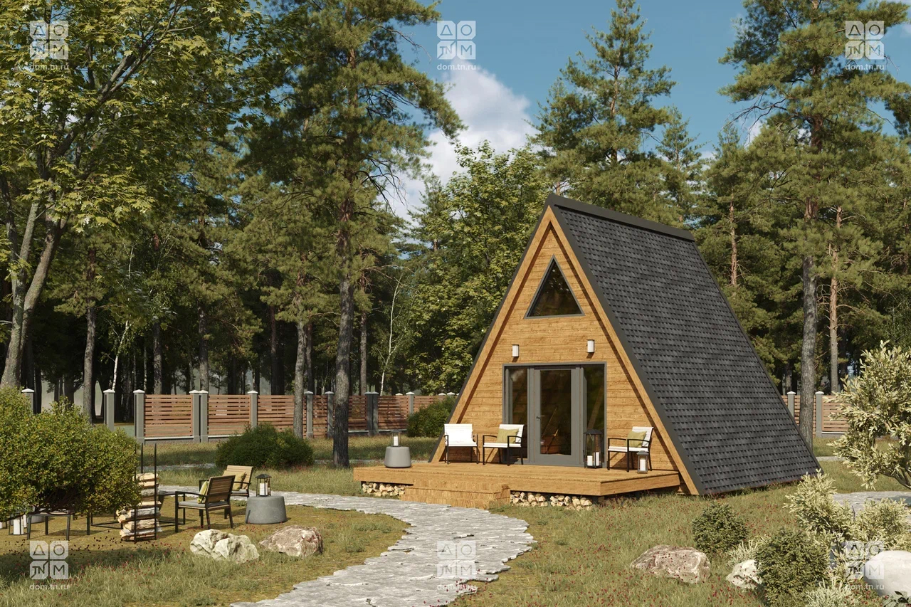 Традиционный одноэтажный дом в стиле А-фрейм с жилой мансардой и открытой террасой. Его общая площадь составляет 37 квадратных метров. Этот дом идеально подойдёт для небольшого участка.