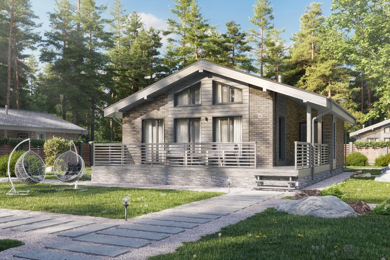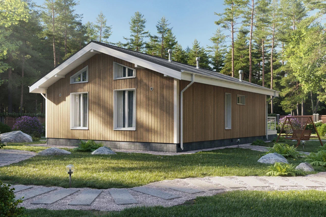 Планировка дома осталась прежней, но изменились размеры помещений. Под двускатной крышей расположены две спальни, кухня-гостиная, зона для отдыха и прихожая. К главному фасаду примыкает терраса без навеса, которая открыта с трёх сторон.