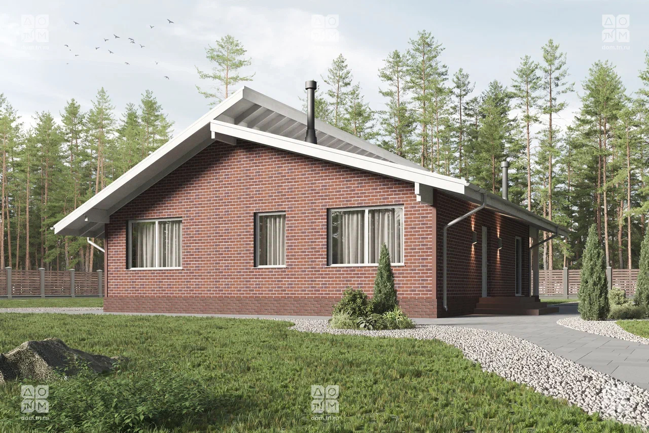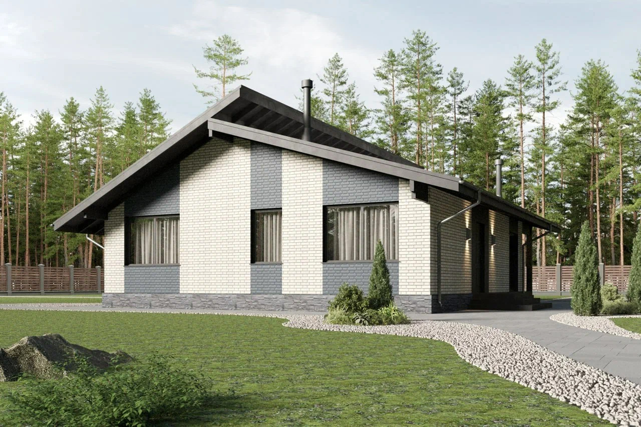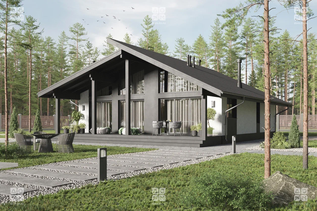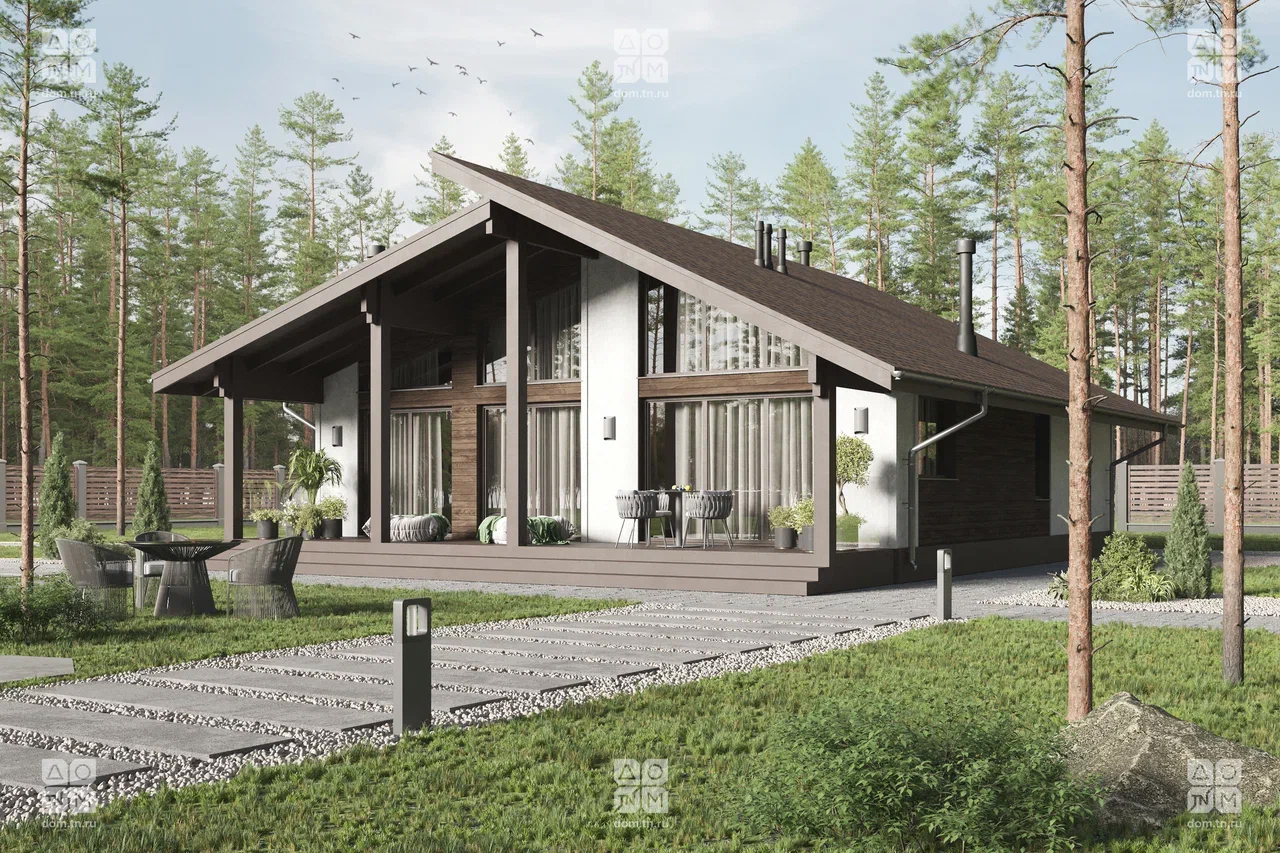 Современный загородный дом в скандинавском стиле общей площадью 116 м² с разноуровневой крышей, большими окнами от пола до потолка и просторной гостиной. В доме есть две спальни и большая крытая терраса.