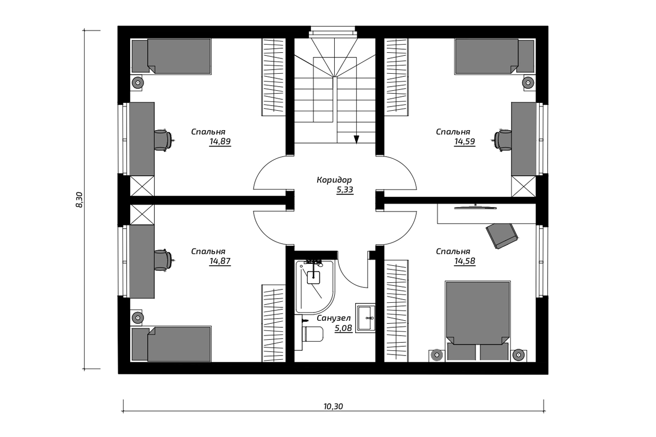 Дом с двумя этажами, общей площадью 146,39 м², в котором есть пять спален и два санузла. На первом этаже находится просторная и светлая гостиная-кухня площадью 29,78 м², а также небольшая прихожая площадью 5,41 м², техническое помещение площадью 7,92 м², ванная комната площадью 6,56 м² и спальня площадью 15,02 м². Второй этаж предназначен для отдыха и уединения каждого члена семьи. Здесь расположены ещё две спальни площадью 15,02 м², две ванные комнаты площадью 4,94 м² и две спальни площадью 14,63 м².